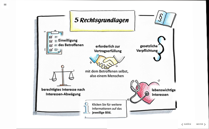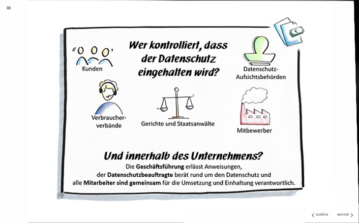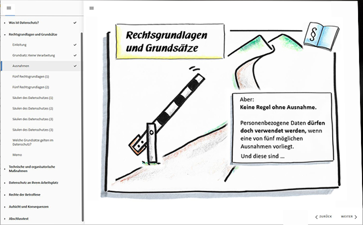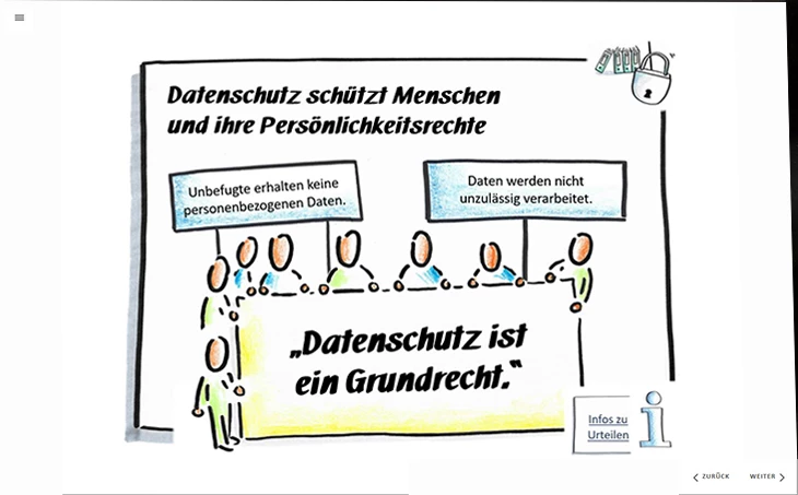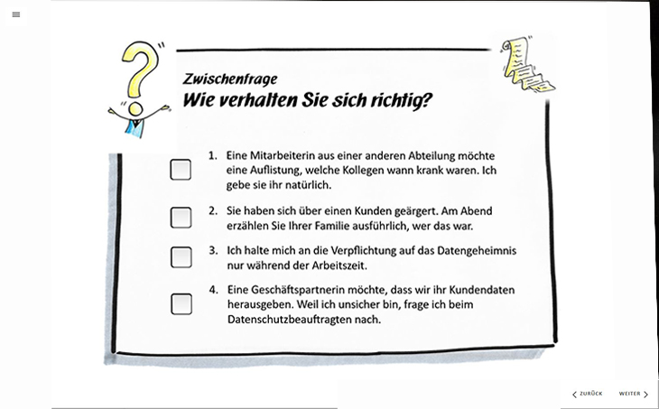 In Form von Texten, Grafiken, Zwischenfragen und vielen praxisnahen Beispielen vermitteln wir Ihren Mitarbeitenden das Thema Datenschutz. Für den Spaßfaktor gibt es Memo-Spiele und lustige Datenschutz-Karikaturen.